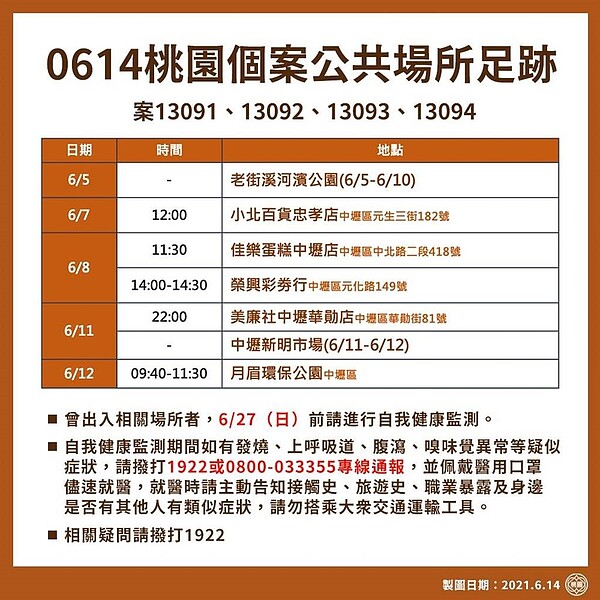 桃園確診足跡 0614更新 今日本土 185 桃園 10 潔絲蜜愛生活 Zi 字媒體